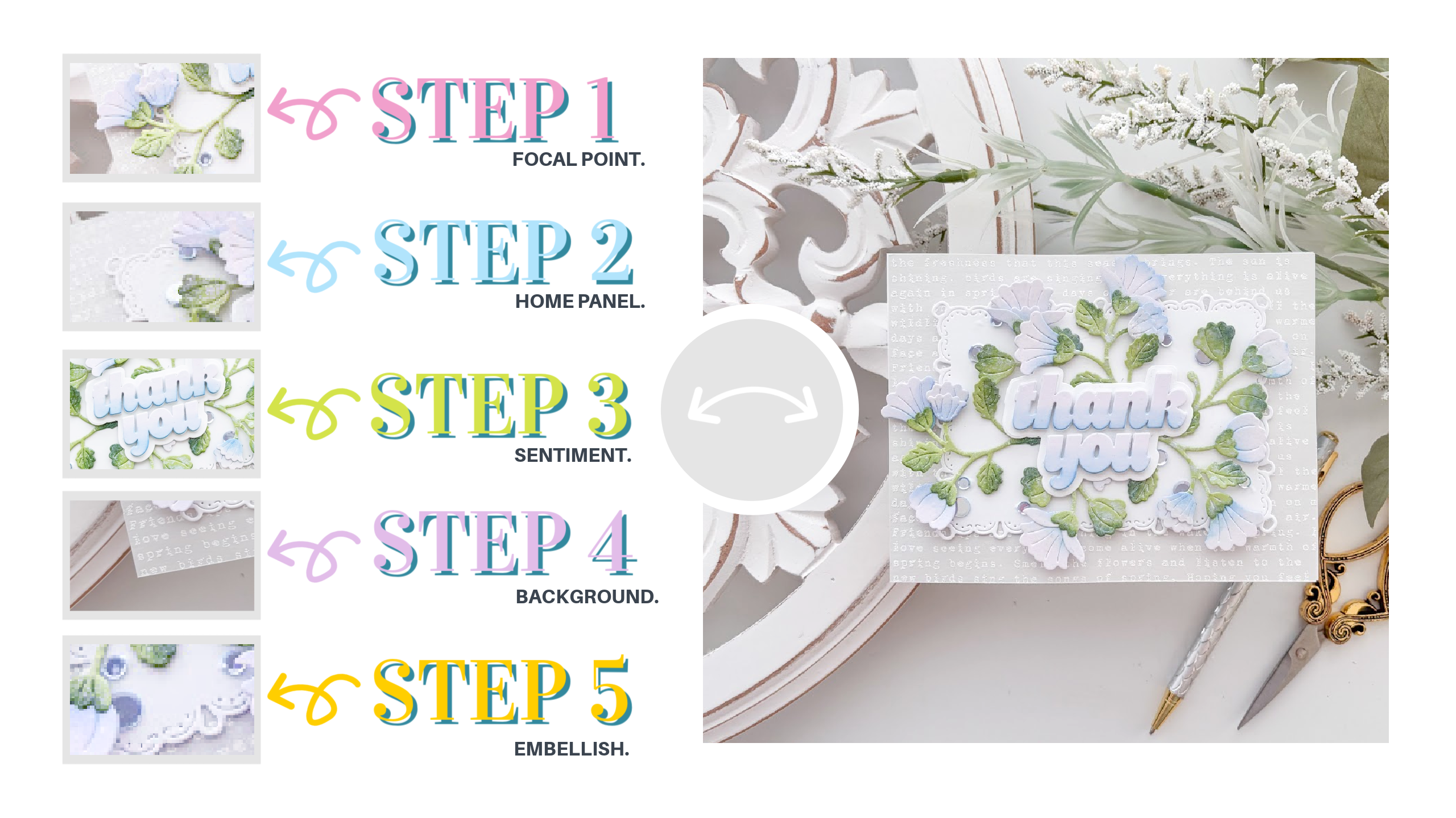 I’m a total sucker for dies and stamps that do the heavy lifting, and these beauties definitely deliver! While I went with a thank you theme today, you could easily swap the sentiment for Mother’s Day or a sympathy card. Enjoy the tutorial.