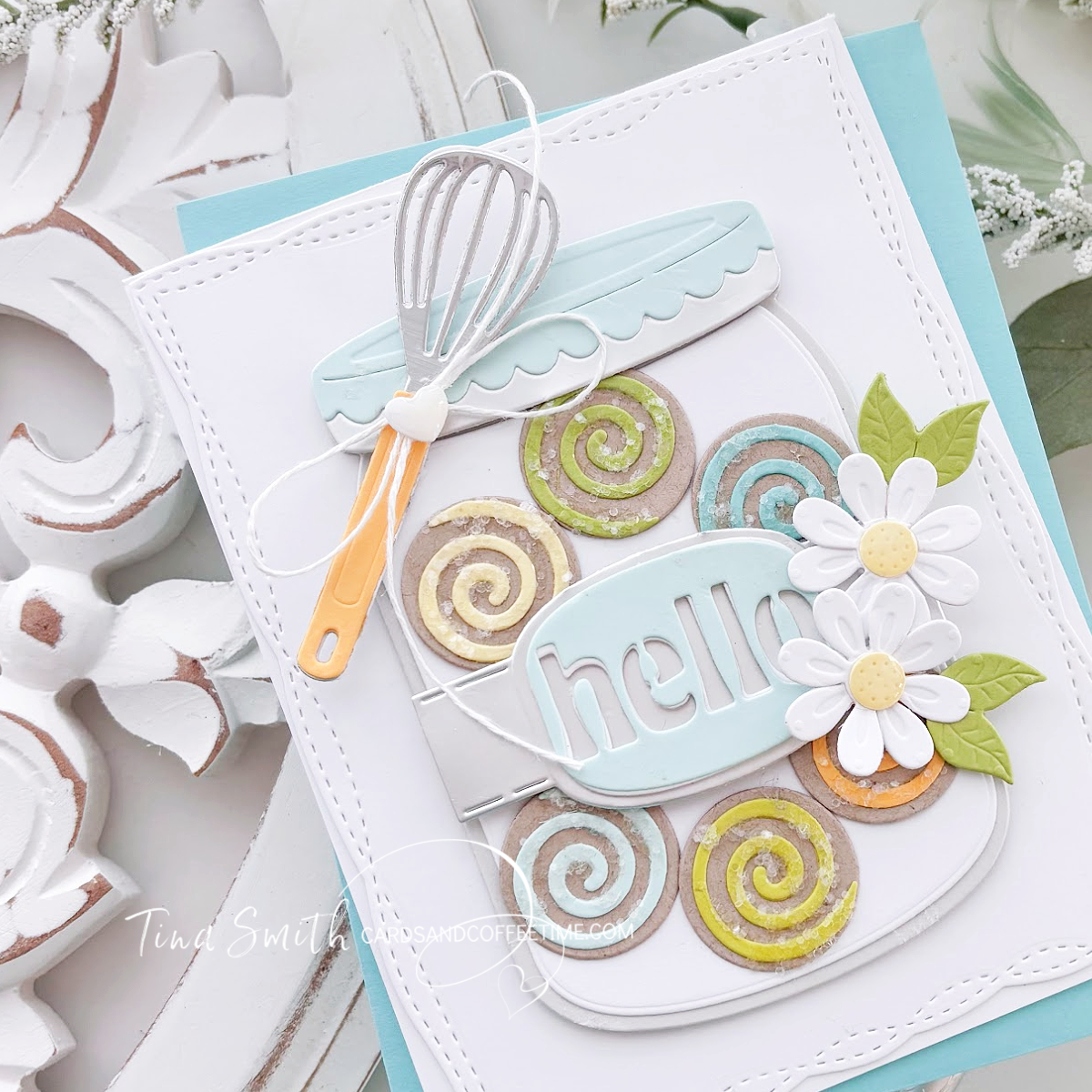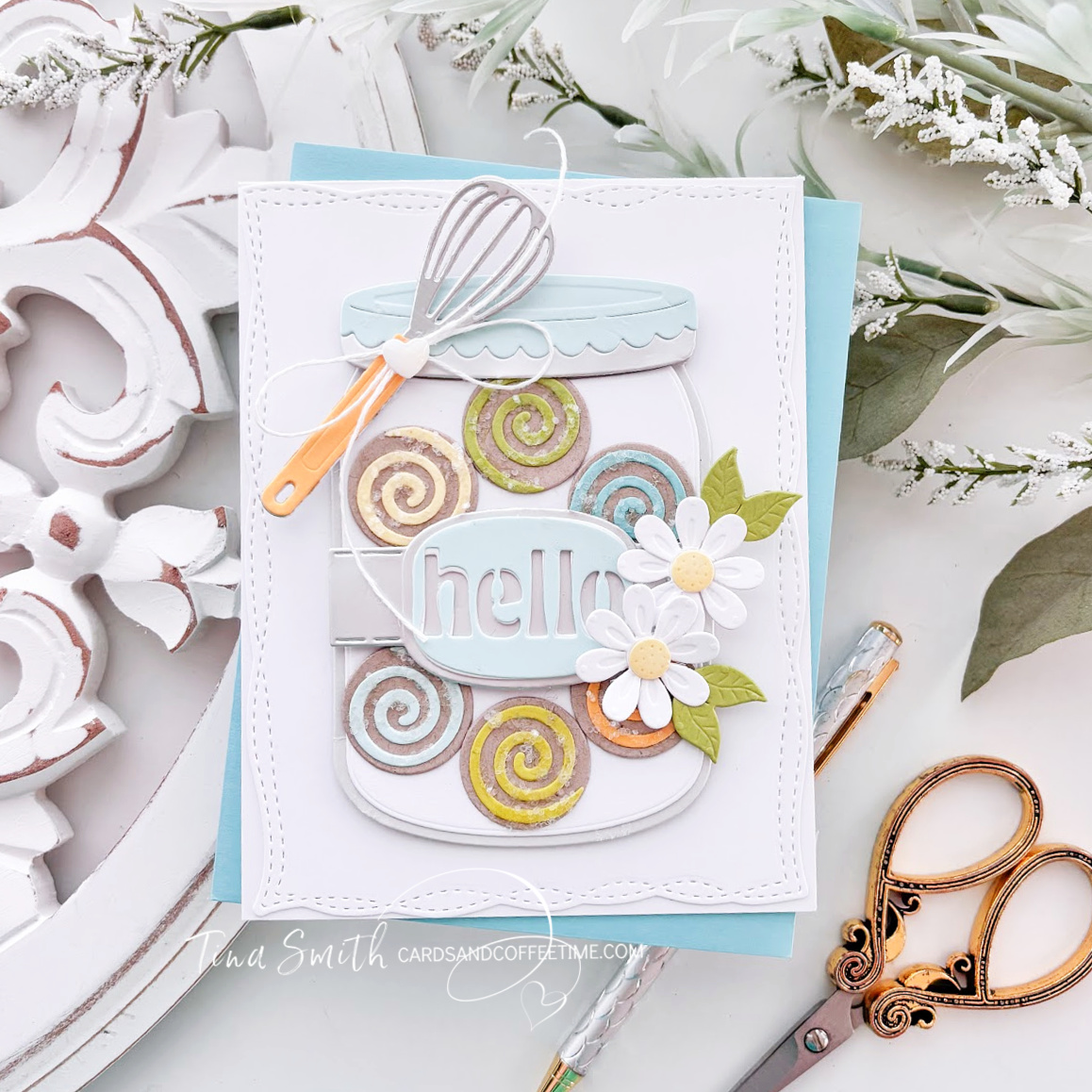 By tucking the whisk from the Fluff, Frost & Roll set and those iconic swirl cookies from the Cool It Cookie Rack inside, we’re creating a “jar of yummy” that’s calorie-free and totally giftable. I’ve laid out the whole recipe for this card in a simple tutorial. Let’s get baking!